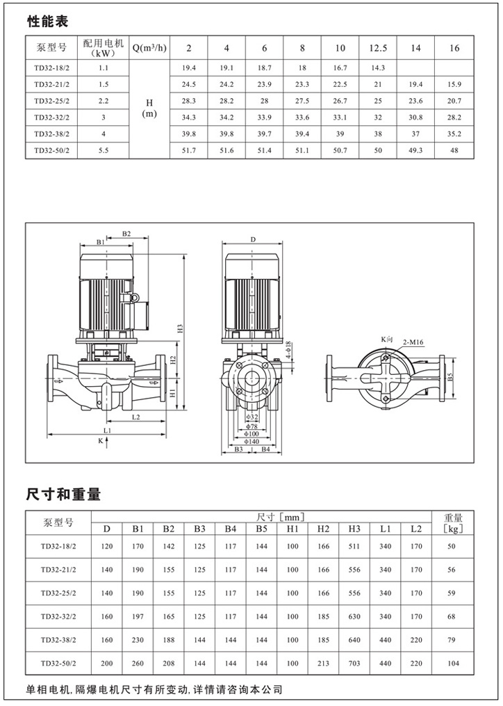 產品介紹 概述 TD32-18/2-1.1KW 鍋爐混流泵,配有標準電機和機械密封。此類產品的結構與相近類型產品相比,更不易受到泵送液體中雜質的影響。 產品設計為頂部可拉出的拆裝形式,其可以在不影響管路系統的情況下對泵進行維護。 應用 產品適宜在清潔、稀薄、非侵蝕、非易爆易燃,且不含有任何可能對泵造成機械或化學損害的固體顆粒和纖維的液體中使用。具體對液體要求及應用如下;而在液體粘稠或密度較大情況下使用時會造成泵特性曲線的下降和能耗的增加。 液體溫度:-15℃~110℃ 系統最高壓力:常規型為PN12巴;特殊型為PN16巴。 TD產品在用于輸送水時,其可以用于生活用水、工業用水、冷卻系統用水和區域供熱系統的冷、熱用水。TD產品可以在以下位置使用: 1) 主循環泵 2) 混合環路中的泵 3) 鍋爐混流泵 4) 燃氣冷凍機泵 5) 部分流量過濾器泵 6) 定壓系統用泵 7) 生活熱水循環 TD產品用于工業方面。如在化工、制藥、食品加工等行業。可以用于: 1) 原料的輸送 2) 系統增壓 3) 混合環路循環泵 安裝條件 產品有不同的安裝要求,具體的安裝要求如下: 1) 系統管路具有支撐泵的能力,2.2kw以下(包括2.2kw)電機的泵可以直接懸置于管道中 ;系統管路不具有支撐泵的能力或泵電機功率大于2.2kw時,泵必須安裝在支架或底板上。 2) 對于配套2.2kw以下(包括2.2kw)電機的泵可以安裝在水平或垂直于管道的位置上;對于2.2kw以上電機的泵只能安裝在垂直于管道的位置上。 3) 泵的安裝,要保證泵在使用時系統管路的張力不應傳遞到泵體上。 4) 為了保證電機的正常運轉,泵要安裝在保證有足夠冷卻的環境條件下,且冷卻空氣的溫度不能超過40℃。 5) 如果泵安裝在戶外,必須配置合適的外罩以防止電器元件進水或凝霜。 6) 為了方便對泵的檢查和維修,在泵的上、下方必須留有足夠的空間。泵電機小于5.5kw時最小留300mm;泵電機大于5.5kw(包括5.5kw)時最小留1000mm。 7) 為了防止噪音和振動,保證獲得最佳運行效果,泵在安裝時要采用減振底座。一般采用水泥底座,底座的重量應該是大于或等于1.5×泵重量。 8) 為滿足客戶的不同需要,產品分為帶底板和不帶底板兩種。 ![]() ![]() 因產品生產批次、型號不同,產品圖片及安裝尺寸僅供參考,詳情可聯系我們的銷售人員了解更多TD32-18/2-1.1KW 鍋爐混流泵相關信息!