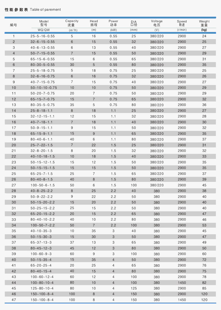 產品介紹 50WQ15-15-1.5立式排污水潛水泵又稱(無堵塞潛水排污泵)是在引用國內先進技術的基礎上,結合國內水泵的使用特點而研制成功的新一代泵類產品,無堵塞潛水排污泵具有節能效果顯著、防纏繞、無堵塞、自動安裝和自動控制等特點。在排送固體顆粒和長纖維垃圾方面,具有獨特效果。該系列排污泵采用獨特葉輪結構和新型機械密封,能有效地輸送含有固體物和長纖維的介質。葉輪與傳統葉輪相比,該泵葉輪采用單流道或雙流道形式,它類似于一截面大小相同的彎管,具有非常好的過流性,配以合理的蝸室,使得該泵具有效率高、葉輪經動靜平衡試驗,使泵在運行中無振動。 50WQ15-15-1.5立式排污水潛水泵水力性能先進、成熟,產品經測試各項性能指標均達到有關標準規定,產品投放市場后以其獨特的功效,可靠的性能,穩定的質量受到廣大用戶的歡迎和好評。 產品特點: 1、采用大流道抗堵塞水力部件設計,大大提高污物通過能力,能有效地通過泵口徑的5倍纖維物質和直徑為泵口徑約50%的固體顆粒。 2、設計合理,配套電機合理,效率高,節能效果顯著。 3、機械密封采用雙道串聯密封,材質為硬質耐腐碳化鎢,具有耐用、耐磨等特點,可以使泵安全連續運行8000小時以上。 4、泵結構緊湊,體積小,移動方便,安裝簡便,無需建泵房,潛入水中即可工作,大大減少工程造價。 5、泵油室內設有油水探頭,當水泵側機械密封損壞后,水進入油室,探頭發生信號,對泵實施保護。 6、可根據用戶需要配備全自動安全保護控制柜,對泵的漏水、漏電、過載及超溫等進行監控,保證泵運行可靠安全。 7、雙導軌自動耦合安裝系統,給泵的安裝、維修帶來了極大的方便,人可不必為此而進出污水坑。 8、浮球開關可根據所需的水位變化,自動控制泵的停啟,無需專人看管。 9、在使用揚程范圍內保證電機動行不過載。 10、根據使用場合電機可采用水套式外循環冷卻系統,能保證電泵在無水(干式)狀態下安全運行。 11、安裝方式有固定自動耦合安裝和移動式自由安裝二種,可滿足不同的使用場合。 使用條件: 1、排污泵系列產品在額定電壓為380V,電源頻率為50Hz時適用 2、介質溫度不超過40攝氏度,介質密度≤1150kg/m3,PH值在5-9范圍之間; 3、海拔高度不超過1000米; 4、輸送介質年粘度不超1000CP; 5、產品工作運行時必須完全潛入水中,但潛水深度不得超過10m; 6、產品材質主要為鑄鐵,不能用于強腐蝕性或含有強腐蝕性的介質中; 注意:在選型或安裝使用前務必使泵實際使用條件符合以上條款,確保產品的正確使用! 產品適用場合: 1、工廠商業嚴重污染廢水的排放。 2、城市污水處理廠排水系統。 3、住宅區的污水排水站。 4、人防系統排水站。 5、醫院、賓館的污水排放。 6、市政工程、建筑工地。 7、勘探、礦山配套附機。 8、農村沼氣池農田灌溉。 9、自來水廠的給水裝置。 ![]() ![]() 因產品生產批次、型號不同,產品圖片及安裝尺寸僅供參考,詳情可聯系我們的銷售人員了解更多50WQ15-15-1.5立式排污水潛水泵相關信息!