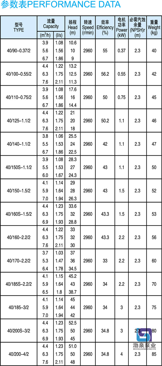 產品介紹 KQL40/125-1.1/2 立式管道循環泵供輸送不含固體顆粒的清水及物理化學性質類似于水的液體之用。同時根據使用溫度、介質等不同在ISG型管道離心泵基礎上派出適用熱水、高溫、腐蝕性化工泵、油泵。該產品具有同效節能、噪音低、性能穩定等特點。 用途: KQL40/125-1.1/2 立式管道循環泵用于空調、采暖、衛生用水、水處理冷卻冷凍系統、液體循環和供水、增壓及灌溉等領域中無腐蝕的冷水和熱水輸送。 工作條件: 轉速:2960r/min,1480r/min或980r/min 流量范圍:1.8~2000m3/h 揚程:≤127m 介質溫度:-10℃~120℃ 環境溫度:最大+40℃;海拔高度小于1000m;相對濕度不超過95% 材質: 泵殼、泵蓋、葉輪:鑄鐵 泵軸:45#鋼鍍鉻或不銹鋼(2Cr13) 機械密封動、靜環:浸銻石墨、碳化硅 結構:結構緊湊的單級泵,適用于現代建筑物。 產品特點: KQL40/125-1.1/2 立式管道循環泵結構緊湊、合理,泵與電機直接連接,外形美觀,占地面積小效率高,閉式鑄鐵葉輪,葉輪懸臂短,機泵軸完全同心,泵運行平穩、可靠,噪音低壽命長,強制環流沖洗機械密封,免保養、無滲漏。 管道泵選型指南: 例如:KQL80/160-7.5/2 或KQW80/160-7.5 KQL標準立式單級離心泵,KQW標準臥式單級離心泵 80進出口直徑 160葉輪名義直徑 7.5/2電機功率/電機極數 ![]() ![]() 因產品生產批次、型號不同,產品圖片及安裝尺寸僅供參考,詳情可聯系我們的銷售人員了解更多KQL40/125-1.1/2 立式管道循環泵相關信息!