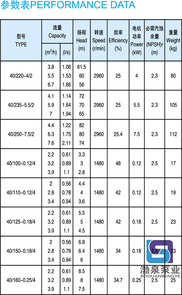 產(chǎn)品介紹 KQL40/100-0.12/2 立式單級(jí)單級(jí)離心泵供輸送不含固體顆粒的清水及物理化學(xué)性質(zhì)類似于水的液體之用。同時(shí)根據(jù)使用溫度、介質(zhì)等不同在ISG型管道離心泵基礎(chǔ)上派出適用熱水、高溫、腐蝕性化工泵、油泵。該產(chǎn)品具有同效節(jié)能、噪音低、性能穩(wěn)定等特點(diǎn)。 用途: KQL40/100-0.12/2 立式單級(jí)單級(jí)離心泵用于空調(diào)、采暖、衛(wèi)生用水、水處理冷卻冷凍系統(tǒng)、液體循環(huán)和供水、增壓及灌溉等領(lǐng)域中無(wú)腐蝕的冷水和熱水輸送。 工作條件: 轉(zhuǎn)速:2960r/min,1480r/min或980r/min 流量范圍:1.8~2000m3/h 揚(yáng)程:≤127m 介質(zhì)溫度:-10℃~120℃ 環(huán)境溫度:最大+40℃;海拔高度小于1000m;相對(duì)濕度不超過(guò)95% 材質(zhì): 泵殼、泵蓋、葉輪:鑄鐵 泵軸:45#鋼鍍鉻或不銹鋼(2Cr13) 機(jī)械密封動(dòng)、靜環(huán):浸銻石墨、碳化硅 結(jié)構(gòu):結(jié)構(gòu)緊湊的單級(jí)泵,適用于現(xiàn)代建筑物。 產(chǎn)品特點(diǎn): KQL40/100-0.12/2 立式單級(jí)單級(jí)離心泵結(jié)構(gòu)緊湊、合理,泵與電機(jī)直接連接,外形美觀,占地面積小效率高,閉式鑄鐵葉輪,葉輪懸臂短,機(jī)泵軸完全同心,泵運(yùn)行平穩(wěn)、可靠,噪音低壽命長(zhǎng),強(qiáng)制環(huán)流沖洗機(jī)械密封,免保養(yǎng)、無(wú)滲漏。 管道泵選型指南: 例如:KQL80/160-7.5/2 或KQW80/160-7.5 KQL標(biāo)準(zhǔn)立式單級(jí)離心泵,KQW標(biāo)準(zhǔn)臥式單級(jí)離心泵 80進(jìn)出口直徑 160葉輪名義直徑 7.5/2電機(jī)功率/電機(jī)極數(shù) ![]() ![]() 因產(chǎn)品生產(chǎn)批次、型號(hào)不同,產(chǎn)品圖片及安裝尺寸僅供參考,詳情可聯(lián)系我們的銷售人員了解更多KQL40/100-0.12/2 立式單級(jí)單級(jí)離心泵相關(guān)信息!