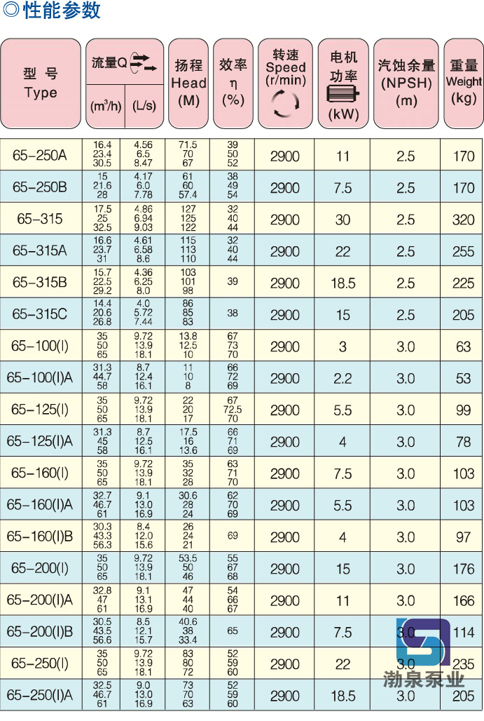 產品介紹 ISW65-315B 臥式熱水輸送泵是采用IS型離心泵之性能參數,在一般臥式泵的基礎上進行巧妙組合設計而成,同時根據使用溫度、介質等不同在ISW型管道泵基礎上派生出適用熱水泵、高溫、耐腐蝕化工泵、油泵。該系列產品具有高效節能、噪音低、性能可靠等優點,符合JB/T53058-93的標準要求,產品按ISO2858標準設計制造。具有效率高、流量及揚程范圍大、結構合理、成本低、壽命長、占地面積小、安裝維修方便等特點。是替代IS、DL等常規產品的新離心泵,特別適用于高層建筑的給排水、噴灌、冶金、市政、礦山水處理排污,食品、化工、空調及其他行業輸送水、化學介質及其他液體。 ISW65-315B 臥式熱水輸送泵流量范圍15~1200m3 /h,分基本型、擴流型、A、B、C切割型等250多種規格,并根據流體介質和溫度不同又派生出清水泵、熱水泵、化工泵、防爆油泵、防爆化工泵等系列產品。 ISW65-315B 臥式熱水輸送泵主要用途 1、ISW臥式清水泵供輸送清水及物理化學性質類似于清水的其它液體之用,適用于工業和城市給排水、高層建筑增壓送水、園林噴灌、消防增壓、遠距離輸送、暖通制冷循環、浴室等冷暖水循環增壓及設備配套,使用溫度T≤80℃。 2、ISWR臥式熱水泵,廣泛適用于:冶金、化工、紡織、造紙以及賓館飯店等鍋爐熱水增壓循環輸送及城市采暖系統,ISWR型使用溫度T≤120℃。 3、ISWH臥式化工泵,供輸送不含固體顆粒,具有腐蝕性。粘度類似于水的液體,適用于石油、化工、冶金、電力、造紙、食品、制藥和合成纖維等部門,使用溫度為-20℃~+120℃。 4、ISWY臥式管道油泵,供輸送汽油、煤油、柴油等油類產品或易燃、易爆液體,被輸送介質溫度為-20℃~120℃。 5、ISWHY型臥式不銹鋼防爆化工離心泵,適用于輸送易燃性化工液體。 6、ISWD臥式低轉速泵,適應要求環境噪聲很低的場合,使用溫度T≤120℃。 ISW65-315B 臥式熱水輸送泵工作條件 1.吸入壓力≤1.0MPa,或泵系統最高工作壓力≤1.6MPa,即吸入口壓力+泵揚程≤1.6MPa、泵靜壓試驗壓力為≤2.5MPa,訂貨時請注明系統工作壓力。泵系統工作壓力大于1.6MPa時應在訂貨時另行提出,以便在制造時泵的過流部分和聯接部分采用鑄鋼材料。 2.環境溫度<40℃,相對濕度<40%。 3.所輸送介質中固體顆粒體積含量不超過單位體積的0.1,粒度<0.2mm。 注:如果用介質為帶有細小顆粒,請在訂貨時說明,以便廠家采用耐磨式機械密封。 ISW65-315B 臥式熱水輸送泵產品特點 運行平穩:泵軸的絕對同心度及葉輪優異的動靜平衡,保證平穩運行,絕無振動。 滴水不漏:不同材質的硬質合金密封,保證了不同介質輸送均無泄漏。 噪音低:兩個低噪音軸承支撐下的水泵,運轉平穩,除電機微弱聲響,基本無噪音。 故障率低:結構簡單合理,關鍵部分采用品質配套,整機無故障工作時間大大提高。 維修方便:更換密封、軸承,簡易方便。 占地更?。撼隹诳上蜃?、向右、向上三個方向,便于管道布置安裝,節省空間。 ![]() ![]() ![]() 因產品生產批次、型號不同,產品圖片及安裝尺寸僅供參考,詳情可聯系我們的銷售人員了解更多ISW65-315B 臥式熱水輸送泵相關信息!