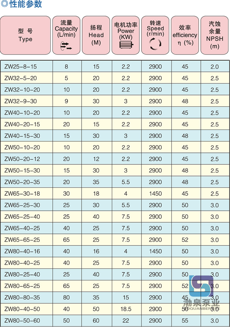 產品介紹 ZW80-50-60 無堵塞高揚程自吸式排污泵是根據ZX型自吸離心泵及QW型潛水排污泵的結構及性能,借鑒國外同類產品之優點,研制而成的集自吸及排污于一身的新型泵種。既可象一般清水自吸泵那樣不需安裝底閥,不需灌引水,又可抽吸含有大顆粒固體直徑為出口口徑的60%和纖維長度為葉輪直徑1.5倍的污物、沉淀物、廢礦雜質、糞便處理及一切工程污水物和膠質液體,完全減輕人力的勞動強度,而且安裝使用方便,極少維修,具有廣闊的應用市場和發展前景。 適用范圍: ZW80-50-60 無堵塞高揚程自吸式排污泵適用于化工、石油、制藥、采礦、造紙、纖維、漿料、紡織、食品、電廠及市政排污工程、公共設施排污、河塘養殖等行業。 產品優點: 1、排污能力強:特殊的葉輪防堵設計,確保了泵高效且無堵塞。 2、高效節能:采用優秀水力模型,效率比一般自吸泵高3~5%。 3、自吸性能好:自吸高度比一般自吸泵高1米,且自吸時間更短。 技術參數: 流量:5-800m3/h; 揚程:12-60m; 電機功率:2.2-55KW; 轉速:1450-2900r/min; 口徑:φ25-φ300; 介質溫度:≤100℃; 自吸高度:4.5-6.0m。 ![]() 結構及工作原理: ZW80-50-60 無堵塞高揚程自吸式排污泵主要由泵體、葉輪、后蓋、機械密封、泵軸、軸承座、進口閥、氣液分離管、加水閥門、進、排接管等組成。泵的結構見下圖。 自吸式無堵塞排污泵的工作原理:泵體內設有儲液腔,并通過上方的回流孔和下方的循環孔與泵工作腔相通,構成泵的軸向回流外混式系統。泵停止工作后,泵內腔已儲有一定容積的液體。當泵起動時,泵內的儲液在葉輪的作用下,夾帶著空氣被向上拋出,液體通過氣液分離管的網格回流到工作腔,氣體被排出泵外,使泵內形成一定的真空度,達到自吸的作用。 第二次工作時泵吸入口處裝有單向逆止閥,因此不需再加儲水即可起動。 ![]() ![]() 因產品生產批次、型號不同,產品圖片及安裝尺寸僅供參考,詳情可聯系我們的銷售人員了解更多ZW80-50-60 無堵塞高揚程自吸式排污泵相關信息!