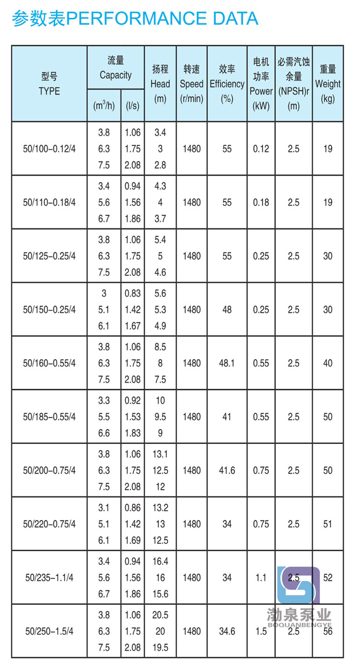 產品介紹 KQL50/220-0.75/4 立式單級單吸離心泵供輸送不含固體顆粒的清水及物理化學性質類似于水的液體之用。同時根據使用溫度、介質等不同在ISG型管道離心泵基礎上派出適用熱水、高溫、腐蝕性化工泵、油泵。該產品具有同效節能、噪音低、性能穩定等特點。 用途: KQL50/220-0.75/4 立式單級單吸離心泵用于空調、采暖、衛生用水、水處理冷卻冷凍系統、液體循環和供水、增壓及灌溉等領域中無腐蝕的冷水和熱水輸送。 工作條件: 轉速:2960r/min,1480r/min或980r/min 流量范圍:1.8~2000m3/h 揚程:≤127m 介質溫度:-10℃~120℃ 環境溫度:最大+40℃;海拔高度小于1000m;相對濕度不超過95% 材質: 泵殼、泵蓋、葉輪:鑄鐵 泵軸:45#鋼鍍鉻或不銹鋼(2Cr13) 機械密封動、靜環:浸銻石墨、碳化硅 結構:結構緊湊的單級泵,適用于現代建筑物的。 產品特點: KQL50/220-0.75/4 立式單級單吸離心泵結構緊湊、合理,泵與電機直接連接,外形美觀,占地面積小效率高,閉式鑄鐵葉輪,葉輪懸臂短,機泵軸完全同心,泵運行平穩、可靠,噪音低壽命長,強制環流沖洗機械密封,免保養、無滲漏。 管道泵選型指南: 例如:KQL80/160-7.5/2 或KQW80/160-7.5 KQL標準立式單級離心泵,KQW標準臥式單級離心泵 80進出口直徑 160葉輪名義直徑 7.5/2電機功率/電機極數 ![]() ![]() 因產品生產批次、型號不同,產品圖片及安裝尺寸僅供參考,詳情可聯系我們的銷售人員了解更多KQL50/220-0.75/4 立式單級單吸離心泵相關信息!