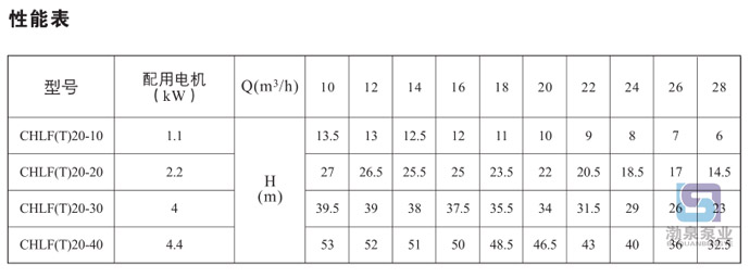 產(chǎn)品介紹 CHLF20-20LSWSC輕型臥式多級離心泵配加長軸電機采用了免修機械密封,緊湊式結構使泵尺寸很小,軸向入口和徑向出口。輕型段式多級離心泵的過流部件均采用不銹鋼材料(304或316)制成,輕型不銹鋼多級離心泵具有低噪音,耐輕腐蝕,外形美觀、體積小、重量輕、使用壽命長等特點,不同材質(zhì)的硬質(zhì)合金密封,保證了不同介質(zhì)輸送均無泄漏;噪音低:兩個低噪音軸承下的水泵,運轉(zhuǎn)平穩(wěn),除電機微弱聲響,基本無噪聲;故障率低:結構簡單合理,整機無故障工作時間大大提高。采用國內(nèi)優(yōu)秀水力模型優(yōu)化設計而成,是理想的新一代高效節(jié)能輕型臥式多級離心泵。采用了免修機械密封。輕型段式多級離心泵的過流部件均采用不銹鋼材料(304或316)制成,具有低噪音,耐輕腐蝕,外形美觀、體積小、重量輕、使用壽命長等特點。 二、應用范圍: 主要用于家庭型中央空調(diào)循環(huán)及工業(yè)上液體的傳輸。如脫礦物質(zhì)水、軟水、凈化系統(tǒng)、輕油等的循環(huán)和增壓。 1)小型中央空調(diào)循環(huán) 2)冷卻系統(tǒng) 3)工業(yè)清洗 4)水處理(水的凈化) 5)水產(chǎn)養(yǎng)殖 6)施肥/計量系統(tǒng) 7)環(huán)境應用 三、工作條件: 稀薄、干凈、不凝、不爆炸、不含固體顆粒或纖維的液體。 液體溫度: 常溫型-15℃至+70℃ 熱水型+70℃至+110℃ 最大環(huán)境溫度:+40℃ 最大運作壓力:10巴 最大進口壓力受最大運作壓力限制 介質(zhì)酸堿性:PH4~9 四、輸送液體: 1、稀薄、清潔、不含固體顆粒或纖維的非易燃易爆液體。 2、泵可以輸送諸如礦泉水、軟化水、純水、清油和其它輕化工介質(zhì)。 3、當輸送液體的密度或粘度大于水,如需要,必須配用大功率電機。 4、泵是否適用于某一特定液體由多種因素決定,其中最重要的是氯含量、PH值、溫度和溶濟、油的含量等。 五、曲線條件: 下述條件適用于后面所示性能曲線。 1、所有曲線都基于電機在恒速2900rpm的測量值。 2、曲線容差符合ISO9906,附錄A。 3、測試采用20℃不含空氣的水,運動粘度為1mm2/s。 4、泵的使用參照加粗曲線的性能范圍,以防流量過小產(chǎn)生過熱和流量過大使電機過載等。 六、電機: 電機為全封閉,風冷式二極電機 防護等級:IP55 絕緣等級:F 標準電壓, 50Hz: 1×220-240V 3×220-240V 380-415V ![]() 因產(chǎn)品生產(chǎn)批次、型號不同,產(chǎn)品圖片及安裝尺寸僅供參考,詳情可聯(lián)系我們的銷售人員了解更多CHLF20-20LSWSC輕型臥式多級離心泵相關信息!