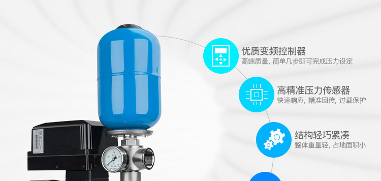 家用智能變頻增壓水泵是一種能直接與自來水管網連接且對自來水管網不產生任何副作用的成套給水設備。家用智能變頻增壓水泵取代了蓄水池和屋頂水箱,能充分利用自來水管網的壓力直接或間接供水,避免了能源的二次浪費和水質的二次污染,大幅度節約了基建投資并縮短了施工工期。全自動家用變頻增壓泵由智能型數字控制壓力表,控制柜,穩流罐,水泵,閥門及管路,基座等組成,適用于一切需要增高水壓,恒定流量的給水系統。變頻水泵是小型一體化機組、小型水泵成套。適用于別墅、學校、醫院、賓館太陽能熱水工程等小型恒壓供水場所。