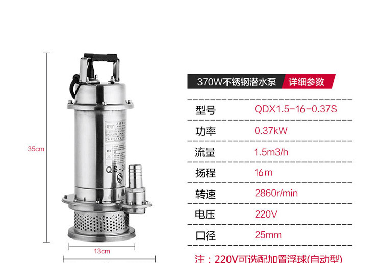 QDX1.5-16-0.37S防腐蝕耐酸堿化工泵是一款采用精密鑄造耐輸送高溫度介質(zhì)(高溫型介質(zhì)溫度可達(dá)120℃)、安裝移動(dòng)方便、多種保護(hù)、可靠性高等特點(diǎn)的一款潛水電泵。是深受國內(nèi)外廣大用戶歡迎的質(zhì)量穩(wěn)定使用壽命長的一款潛水泵。 產(chǎn)品概述: 1、QDX1.5-16-0.37S防腐蝕耐酸堿化工泵整體采用不銹鋼精密鑄造,耐腐蝕,環(huán)保型,外形美觀,體積小,經(jīng)久耐用。 2、采用氟橡膠雙端面機(jī)封,氟橡膠徑向O型圈密封,有效地對(duì)環(huán)境惡劣的液體進(jìn)行密封保護(hù)作用。 3、電機(jī)采用F級(jí)絕緣,裝有熱保護(hù)裝置,大大延長了泵的使用壽命。 4、可根據(jù)客戶特殊要求定制防腐蝕電纜線、四氟機(jī)封,及高溫液體的零件配置。 5、采用不銹鋼閉式?jīng)_壓焊接葉輪,大大提高了揚(yáng)程。 使用條件: 1、電泵潛入水下深度不超過5m。 2、輸送介質(zhì)溫度不超過60℃。 3、輸送介質(zhì)的PH值304(4-10), 316(2-13)。 4、輸送介質(zhì)中含固體顆粒直徑不大于0.2mm,體積不超過0.1%。 主要用途: 適用于工礦企業(yè)、食品行業(yè)、海水養(yǎng)殖、景觀工程、深井提水、農(nóng)田灌溉等一般腐蝕性介質(zhì)。 ![]() ![]() ![]() ![]() ![]()