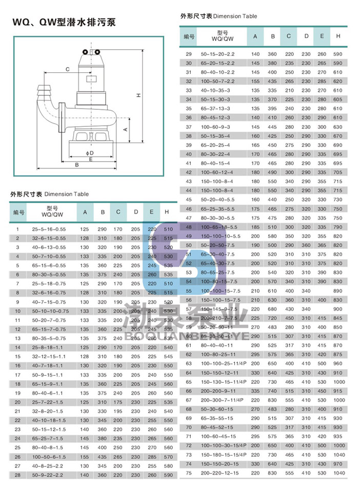 耐高溫排污泵WQR系列型號50WQR10-10-0.75 流量:10立方/小時 揚程:10米 功率:0.75千瓦 材質:鑄鐵(可生產不銹鋼材質) 耐溫100度。具有抽送介質溫度高、安裝移動方便、高效節能、防纏繞、無堵塞等特點。可用于輸送含污物、固體顆粒、纖維的高溫液體介質。 主要用途: 1、市政工程、建筑工地。 2、城市污水處理排放系統。 3、企業、單位廢水排放。 4、住宅區的污水排放,. 5、地鐵、地下室、人防工程, 6、醫院、賓館、高層建筑污水排放。 7、自來水廠、水利工程等。 8、養殖場、化糞池。 9、電廠、鋼鐵廠抽送熱水。