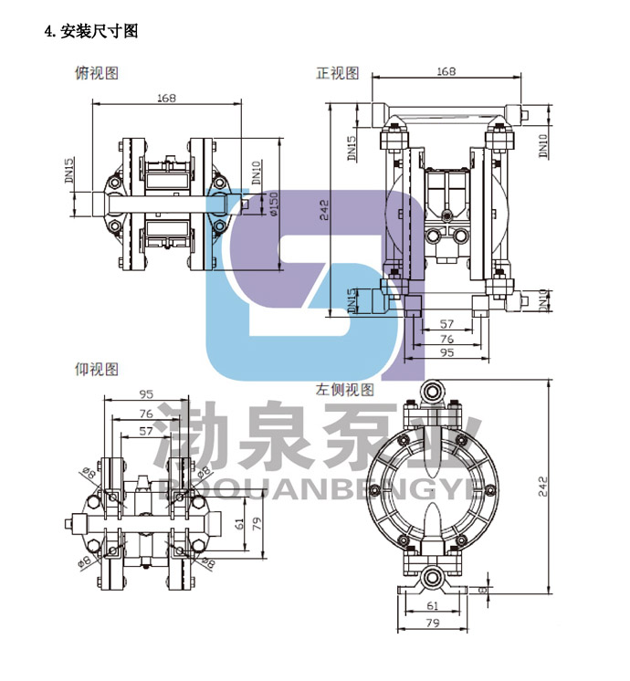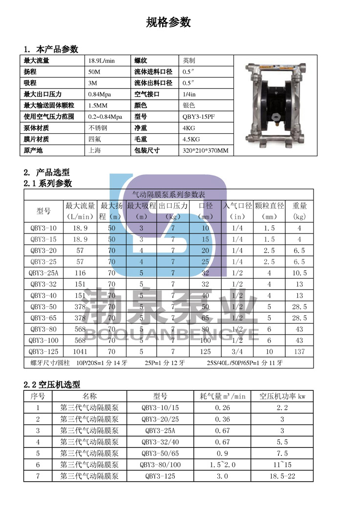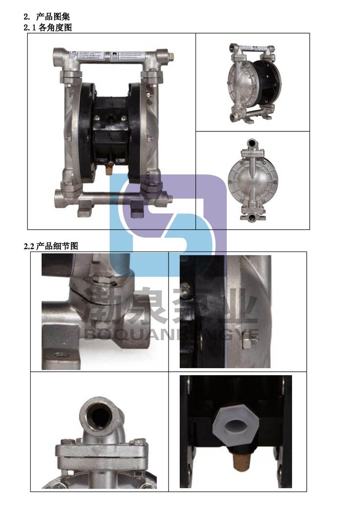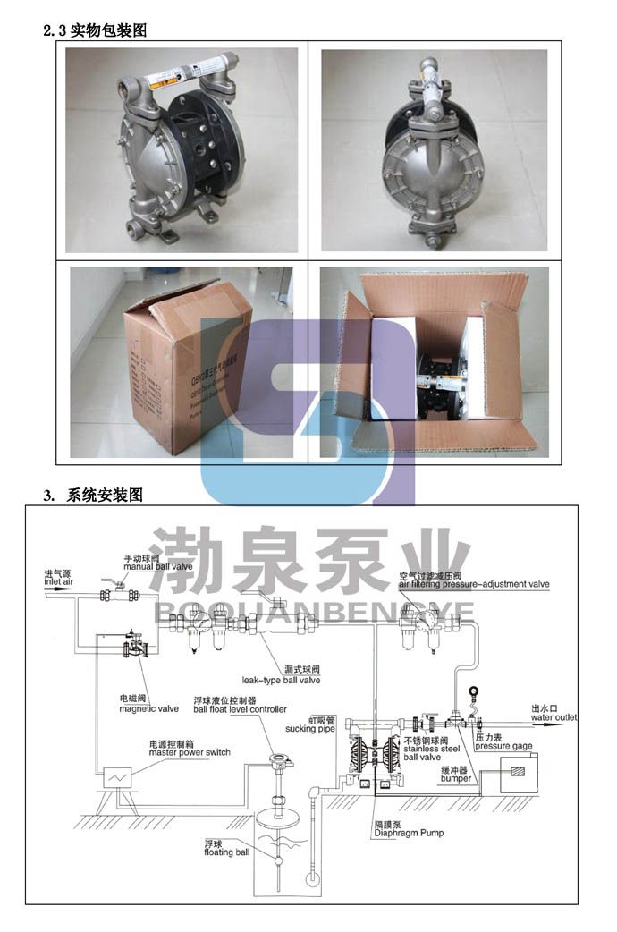 1.產品概述: QBY3系列第三代氣動隔膜泵,采用壓縮空氣為動力源,是一種由膜片往復變形造成容積變化的容積泵。不銹鋼氣動隔膜泵具有質量可靠、使用壽命長、噪音底、震動小、永不死機、做工精細等六大優點,既能抽送流動的液體,又能輸送一些不易流動的介質,具有自吸泵、潛水泵、屏蔽泵、泥漿泵和雜質泵等輸送機械的許多優點。 性能特點: 1.不需灌引水,吸程高達5米,揚程達70米,出口壓力≧7bar; 2.流動寬敞,通過性能好,允許通過最大顆粒直徑達10毫米。抽送泥漿、雜質時,對泵磨損甚微; 3.揚程、流量可通過氣閥開度實現無級調節(氣壓調節在1-7bar之間); 4.該泵無旋轉部件,沒有軸封,隔膜等抽送的介質與泵的運動部件、工件介質完全隔開,所輸送的介質不會向外泄漏。所以抽送有毒、易揮發或腐蝕性介質時,不會造成環境污染和危害人身安全; 5.不必用電,在易燃、易爆場所使用安全可靠; 6.可以浸沒在介質中工作; 7.使用方便、工作可靠、開停只需簡單地打開和關閉氣體閥門,即使由于意外情況而長時間無介質運行或突然停機泵也不會因此而損壞,一旦超負荷,泵會自動地停機,具有自我保護性能,當負荷恢復正常后,又能自動啟動運行; 8.結構簡單、易損件少,該泵結構簡單,安裝、維修方便,泵輸送的介質不會接觸到配氣閥,聯桿等運動部件,不像其他類型的泵因轉子、活塞、齒輪、葉片等部件的磨損而使性能逐步下降; 9.可輸送較粘的液體(粘度在1萬厘泊以下); 10.本泵無須用油潤滑,即使空轉,對泵也無任何影響,這是該泵一大特點; 11.塑料法蘭壓力:PN0.6MPa(10bar),金屬法蘭壓力:PN1.0MPa(10bar)。 ![]() ![]() ![]() ![]() ![]()