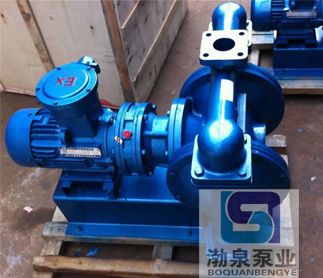 7、蒸汽壓力:所有液體在其自由表面上的蒸汽產生壓力在任何泵操作系統中,操作壓力都不能低于蒸汽壓,形成的蒸汽將部分或完全切斷入泵的流體; 8、粘度:由于流體內部摩擦的存在,粘度這一性質使流體產生流動阻力; 9、水錘作用:較高的進口形成靜壓頭作用于泵上產生內壓。 二、隔膜泵故障排除 故障:隔膜泵沒有動作或運作很慢; 排除:1.檢查空氣入口端的濾網或空氣過濾裝置是否有雜質; 2.檢查空氣閥是否卡住,用清潔液清洗空氣閥; 3.檢查空氣閥是否磨損,必要時更換新的零件; 4.檢查中心體的密封零件狀況,如果嚴重磨損,則無法達到密封效果,而且空氣會從空氣出口端排掉。由于其特別構造; 5.檢查空氣閥中的活塞活動是否正常; 6.檢查潤滑油的種類。添加的潤滑油如果高于建議用油的粘度,則活塞可能卡住或運作不正常。建議使用輕薄及抗凍的潤滑油; 7.檢查泵有動作,但是流量小或完全沒有液體流出; 8.檢查泵的氣穴現象,降低泵的速度讓液體進入液室; 9.檢查閥球是否卡住。如果操作液體與泵的彈性體不相容,彈性體會有膨脹的現象發生。請更換適當材質的彈性體; 10.檢查泵入口的接頭是否完全鎖緊不漏,尤其是入口端閥球附近的卡箍需鎖緊。 故障:泵的空氣閥結冰: 排除:檢查壓縮空氣含水量是否過高,安裝空氣干燥設備。 故障:泵的出口有氣泡產生 排除:檢查膜片是否破裂,檢查卡箍是否鎖緊,尤其是入口管卡箍。 故障:產品自空氣排放口流出 排除:檢查膜片是否破裂,檢查膜片及內外夾板在軸上是否夾緊,閥發出嘎嘎聲。 新研制開發的DBY型電動隔膜泵,采用XLD系列擺線針輪減速機傳動動力,電動隔膜泵是一種新型的泵類,近年來,由于在隔膜材質上取得了突破性的進展,國際上越來越多的工業化國家采用此種型式的泵,取代部份離心泵、螺桿泵,來應用于石化、陶瓷、冶金等行業,產品設計均參考美國ABEL公司樣機,該泵適用于低壓,即出口壓力≤3kgf/cm2的場合。 DBY系列電動隔膜泵具有下列特點: